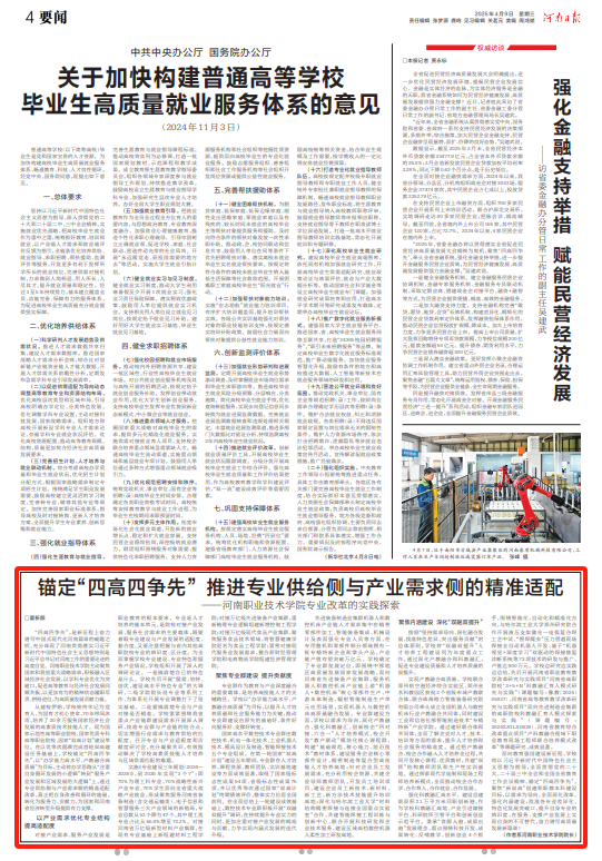 “四高四争先”,是新征程上奋力谱写中国式现代化河南篇章的破题之钥,充分体现了河南贯彻落实习近平新时代中国特色社会主义思想特别是习近平总书记对河南工作的重要论述的高度自觉。河南职业技术学院主动聚焦国家和我省重大战略需求,积极融入区域经济社会发展,以学科专业优化为突破口,促进高等教育与经济社会发展同频共振,以更加有为的精神状态履职尽责、拼抢进位,为高质量发展贡献力量。