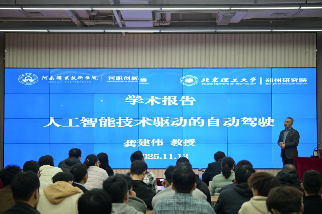 11月13日下午,学校在河职创新港519学术报告厅举办“人工智能技术驱动的自动驾驶”学术报告会。北京理工大学机械与车辆学院教授、博士生导师龚建伟围绕“AI+自动驾驶”的技术演进、关键算法与产业落地作专题分享。学校高层次人才、汽车与交通学院师生代表110余人参会。
