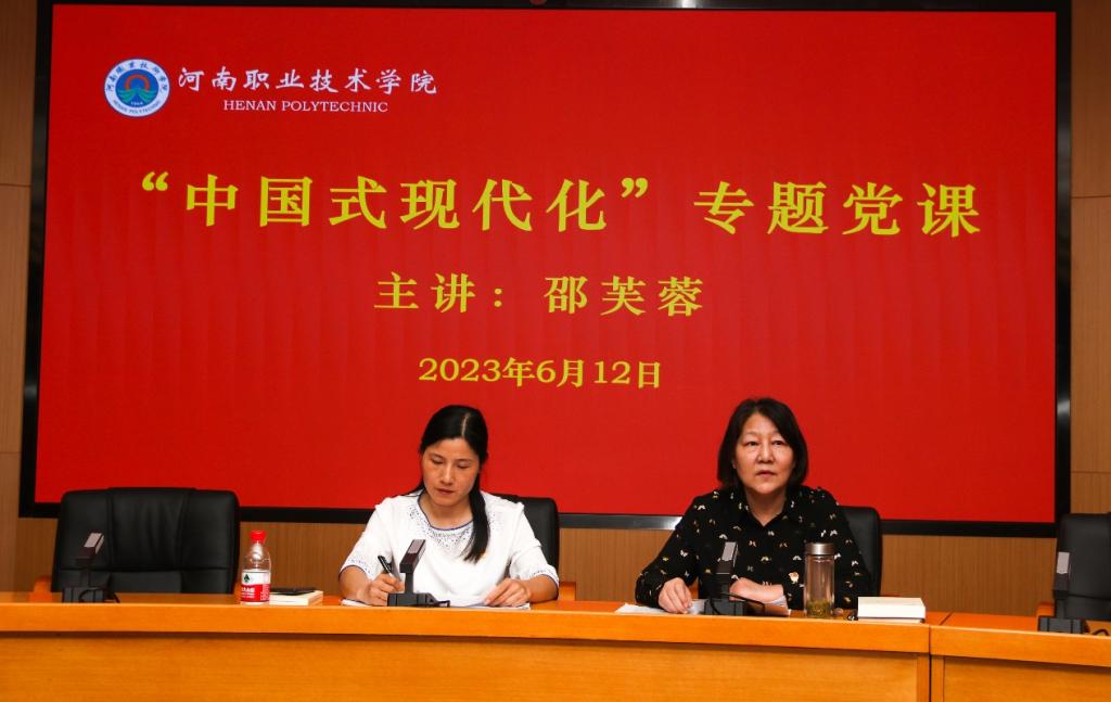 6月12日下午,副校长邵芙蓉在行政楼239会议室为现代信息技术学院全体党员讲授《中国式现代化》专题党课,该院全体党员认真聆听党课。