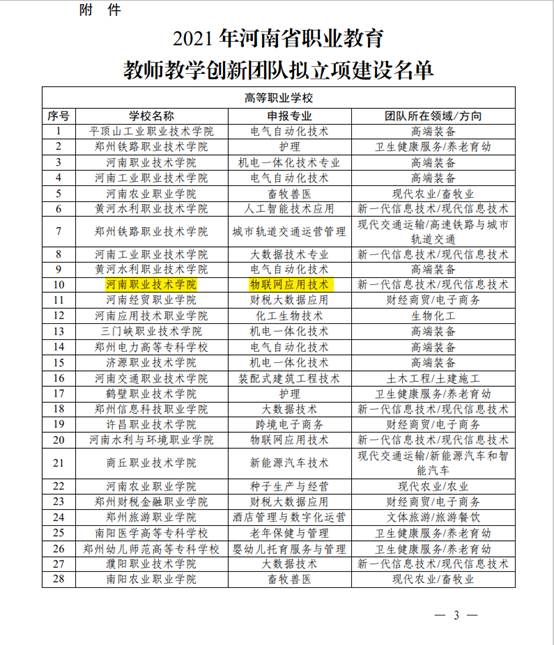 2021年5月,学校物联网应用技术专业获批“河南省职业教育教师教学创新团队”立项建设单位。